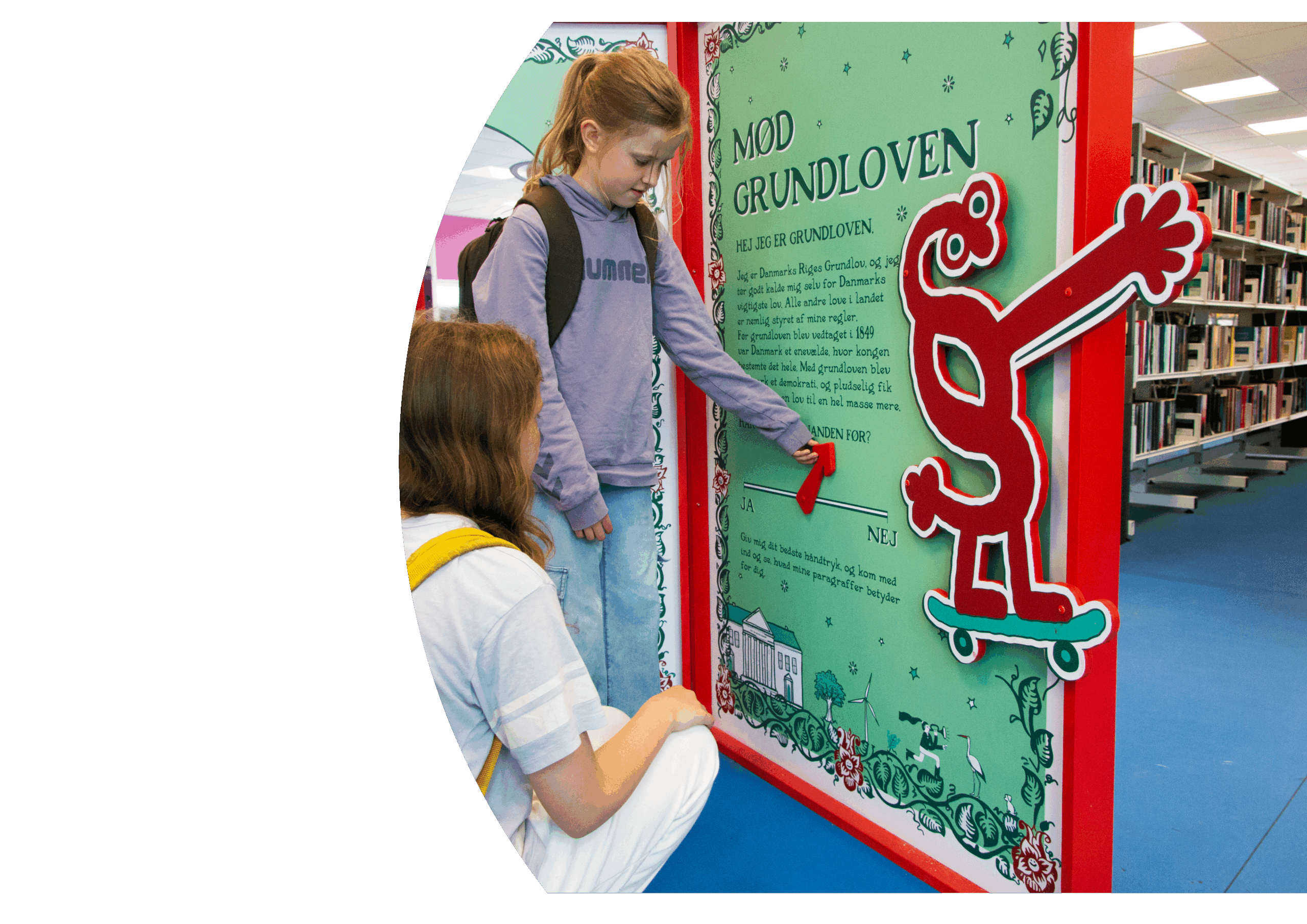 Med Bibliotekerne og Folketinget har vi udviklet en interaktiv udstilling. En to meter høj grundlov giver børn mulighed for at reflektere over grundloven og dens betydning for dem, og de inviteres til at skrive deres egen paragraf 90. Udstillingen har turneret i hele landet.